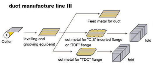 生產(chǎn)Ⅲ線是由上料架、調(diào)平壓筋機(jī)、沖尖口和沖方口油壓機(jī)、液壓剪板機(jī)、液壓折邊機(jī)所組成。電器控制部分采用全電腦控制,該控制系統(tǒng)具有閉環(huán)反饋系統(tǒng),生產(chǎn)精度和穩(wěn)定性明顯升高。其大工作速度為10米/分。長度誤差為±0.5mm,對角線誤差 ±0.8mm。 本系統(tǒng)可單班生產(chǎn)1000M2方型風(fēng)管能力。